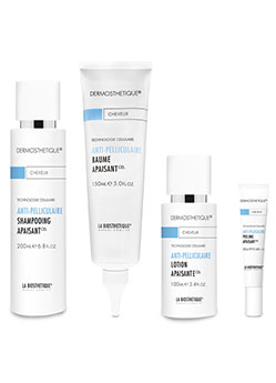LA BIOSTHETIQUE hat mit DERMOSTHETIQUE ANTI-PELLICULAIRE ein neues, innovatives, hochwissenschaftliches Programm für sensible Kopfhaut entwickelt, das dauerhafte Schuppen sehr wirksam bekämpft – mit einem Mehrfachwirkkonzept. Es besteht aus drei Produkten: Shampoo, Kopfhautlotion und Sofortpflege. Das Ergebnis ist fantastisch. Bereits nach einer Anwendung werden die sichtbaren Schuppen deutlich weniger.